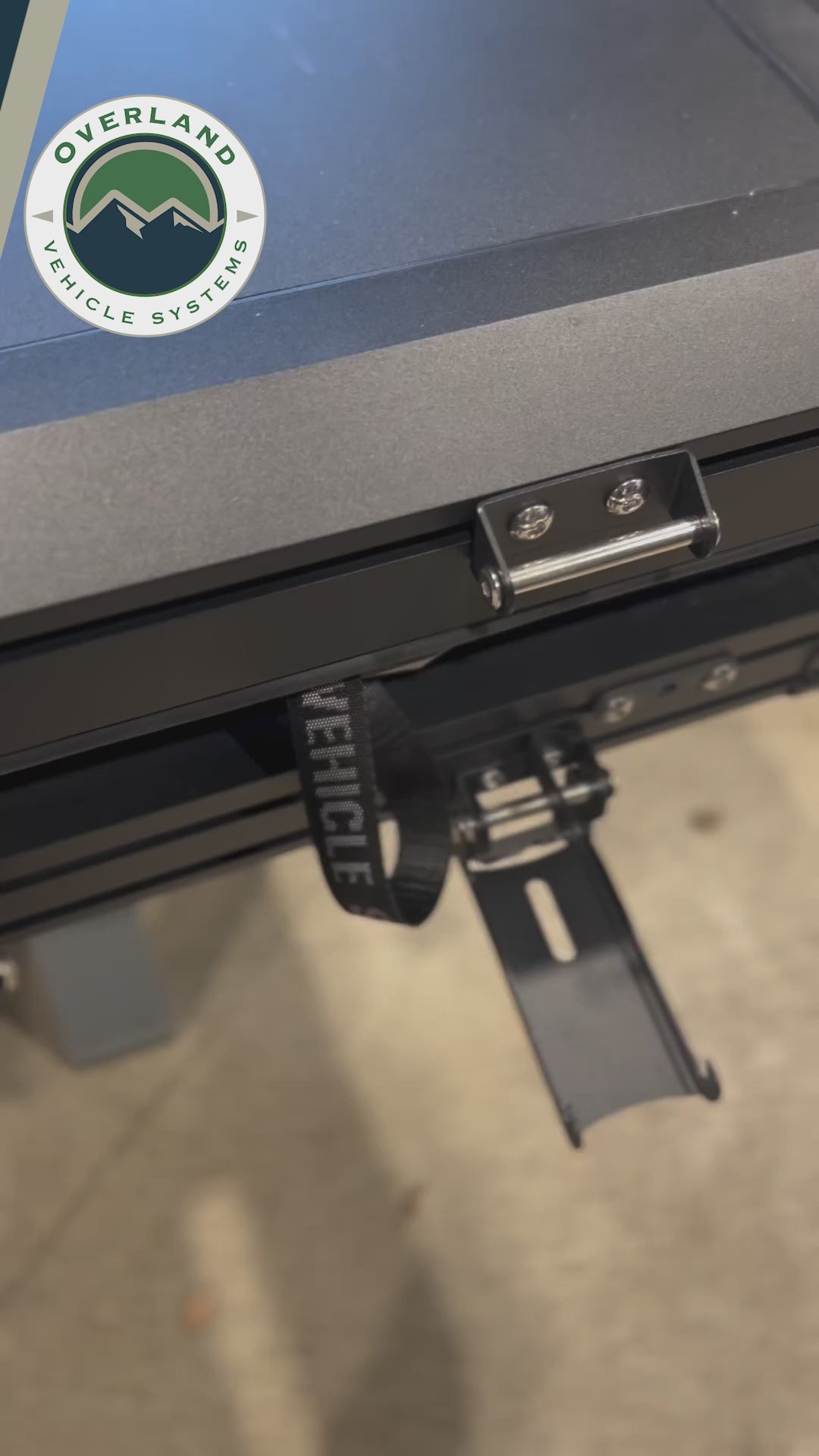 The LD TMON Clamshell Aluminum Roof Top Tent by Overland Vehicle Systems is designed for budget-conscious overlanders who demand durability and convenience on their adventures. This 2-person tent features a sturdy tan body and green rainfly, offering a perfect blend of camouflage and style for your off-road journeys.